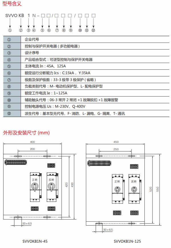 以數字化產品 SVVOKB1作為主開關,集成熔斷器、斷路器、接觸器、起動器、隔離器、熱繼電器、過載 ( 或 過流、斷相 ) 保護繼電器、電機綜合保護器、智能漏電繼電器等低壓電器產品功能于一體,通過機械聯鎖 和電氣聯鎖等附件組合,構成可逆型電動機控制與保護開關電器 SVVOKB1-N,適用于電動機的可逆或雙向控制與保護。產品根據需要安裝相應附件,具有可靠性高、分斷能力高、壽命指標高,體積小、安裝面積小、安裝維護工作量小等優點。