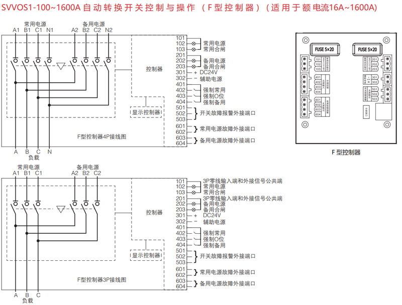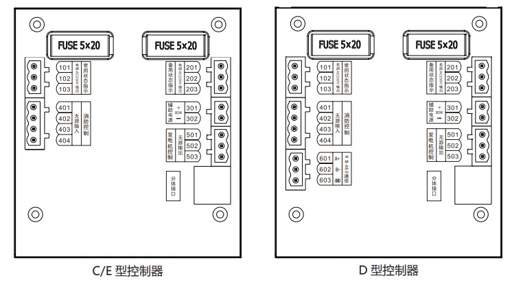 401、402- 消防聯動控制信號輸入端,該接口外部只能接一組常開無源觸點(若消防設備送出信號為有源信號時,必須先通過一個小型繼電器轉接后再將繼電器常開觸點接入控制器,否則會燒毀控制器) 當外部觸點閉合后控制器立即控制開關轉換到分閘位置切斷負載電源,同時通過 403 和 404 端子返回一個信號到消防控制中心;