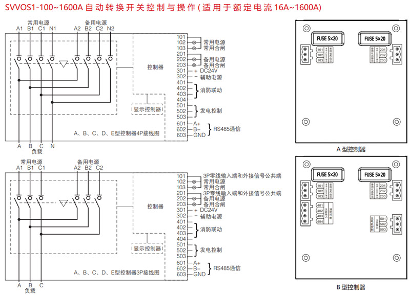 403、404- 內部為一組常開繼電器干節點,用于消防動作返回信號之用;端子在正常的時候為常開,當有消防信號送入控制器且開關轉換到分閘位置時 403 和 404 接通。(注:當消防聯動功能啟動后自動轉換開關將停止工作,若要使開關在正常轉換,必須先撤除消防信號,再將控制面板上的自動手動控制開關轉換一次后開關即可恢復正常轉換。)